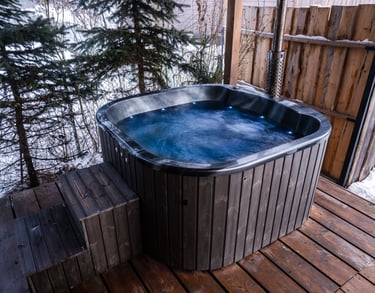 Domek nr 1: sauna i balia znajdują się na zewnątrz – idealne na odprężenie pod otwartym niebem.